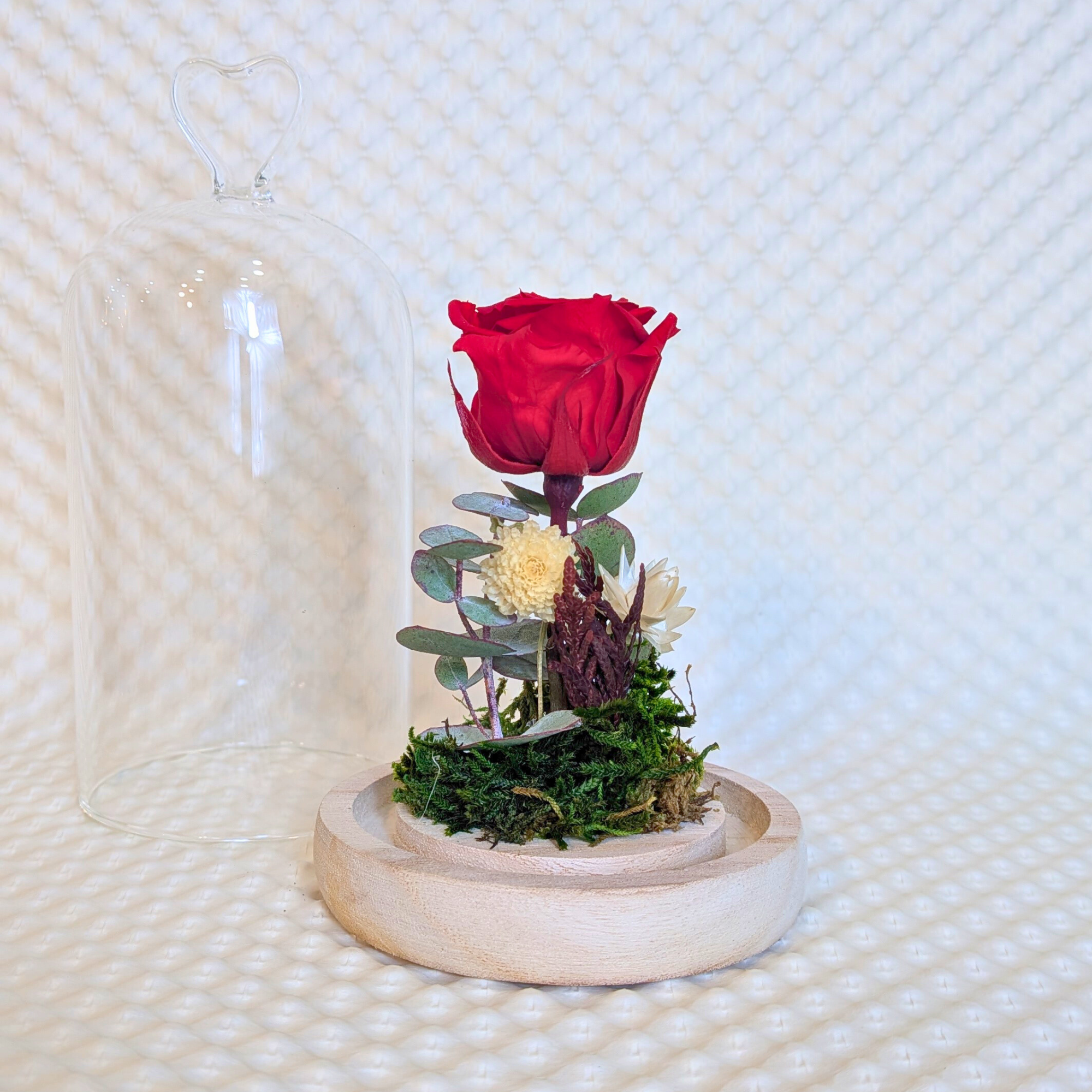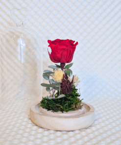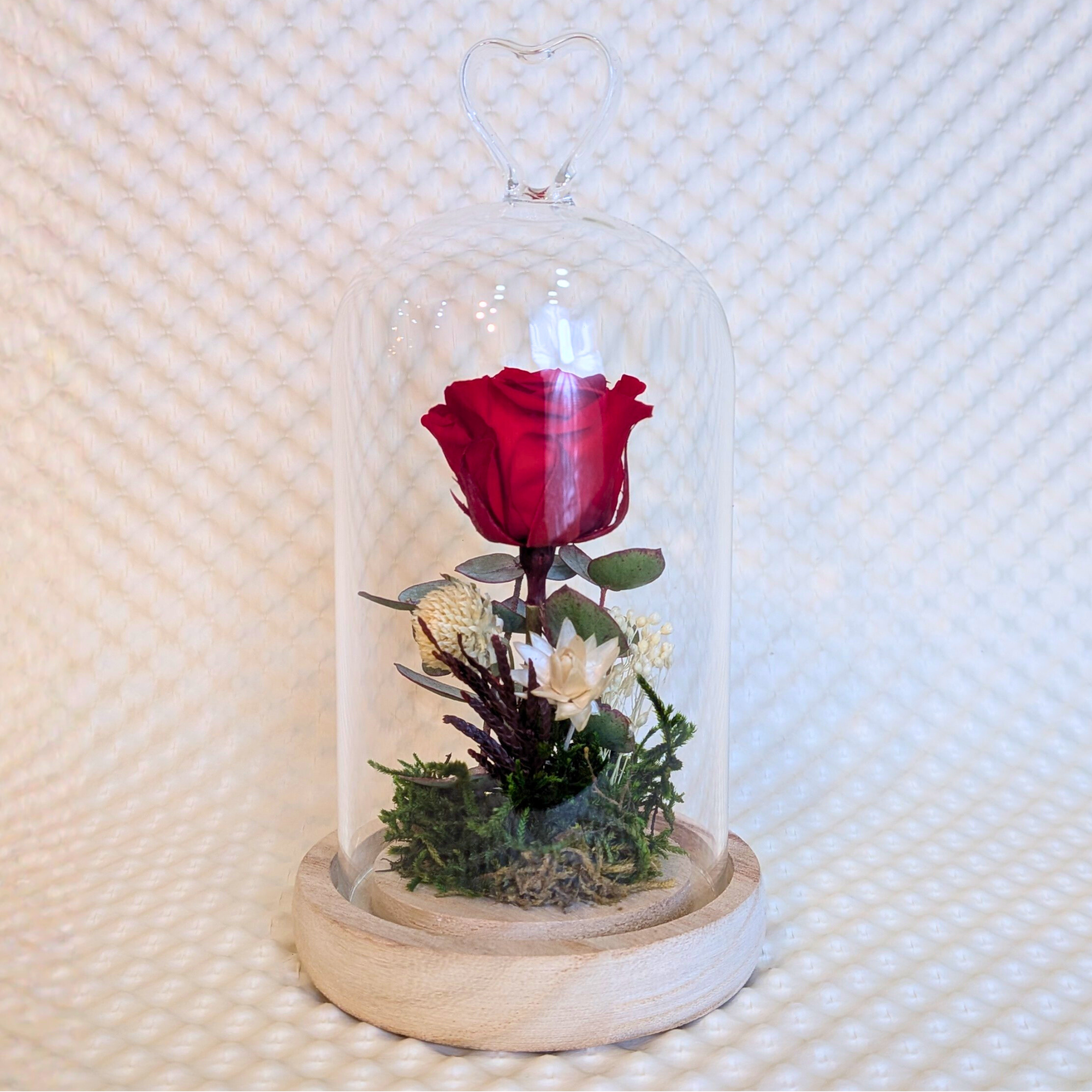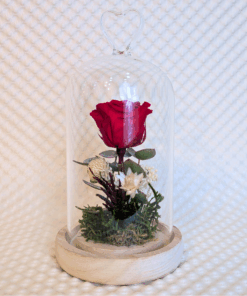 Cúpula de vidre amb nansa en forma de cor a la part superior. A l’interior hi ha una rosa preservada vermella, molsa preservada i petites flors seques de color blanc.